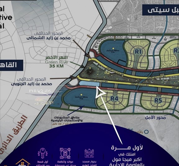 كما خططت لإقامة ميجا مول بيراميدز العاصمة الإدارية أمام مسجد الفتاح العليم وأمام أكبر تجمعات سكنية بالعاصمة الإدارية وهما الحي السكني الخامس R5 والحي السكني السادس R6 بالإضافة إلى وقوعه بالقرب من المعالم المميزة بالعاصمة منها :